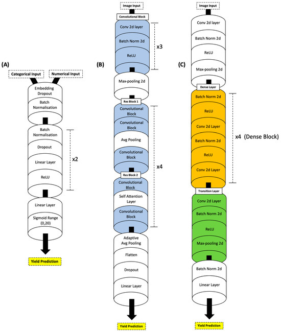 Several established architectures including XResNet and DenseNet are available in the FastAI and PyTorch libraries and serve as foundational models specific for image-based data for evaluation and to be further refined using Optuna [41,46,51,52,53]. In this study, we compared the model performance of XResNet with DenseNet, due to their respective strengths for computer vision tasks, especially in agriculture [54,55,56,57]. The ResNet architecture was employed as it was successfully integrated into the previous iteration of the multimodal deep learning model [14]. In addition, the ResNet architecture developed by He et al. [51] remains a popular framework for machine learning tasks, serving as a gold standard for numerous scientific publications as a baseline for comparison with more recently developed architectures [58]. ResNet’s popularity also stems from its simple design, which uses a single identity shortcut to retain feature information by skipping residual blocks [55]. This simple design has drawbacks, as the use of the shortcut limits the model’s learning capabilities [55]. DenseNet architectures have been extensively used in image classification tasks such as weed and crop identification and plant disease detection with high accuracies [54,56,57]. In DenseNet, the introduction of a dense connectivity between all layers ensures that each layer receives input from all previous layers which facilitates the efficient transfer of information across model layers [52,55]. DenseNet has been shown to outperform ResNet architectures by achieving lower error rates with fewer parameters [52,55]. Compared with ResNet, DenseNet requires more computational power and involves a longer training period [55]. Due to their strengths and limitations, DenseNet serves as an appropriate comparator with ResNet for maize yield estimation. Transfer learning was applied for each model being evaluated. The best-performing image–deep neural network (image-DNN) was integrated into the multimodal framework.