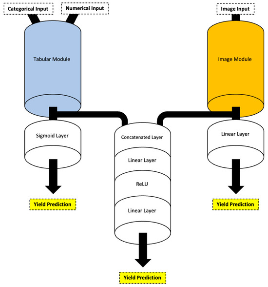 Rising attention towards the use of multimodal data within deep learning frameworks mirrors the benefits that stem from combining complementary sources of data [14,17,18,19,20]. For example, tabular deep neural network (DNN) architectures have been shown to significantly improve in multimodal frameworks due to the ability of different modalities to share complementary information, known as co-learning [14,21]. This process involves integrating different forms of data—or modalities—such as images and text, into deep learning models [17]. Combining information from different modules provides increased contextual information compared with a single modality by itself [17]. Several studies have documented improved predictive power with multimodal deep learning models [14,18,19,20,22,23,24]. For example, Maimaitijiang et al. [22] reported multimodal data fusions from RGB, multispectral, and thermal sensors outperforming single modalities when predicting soybean grain yield, regardless of the machine learning method used, with intermediate-level feature fusion-based DNN displaying the highest performance (relative root mean square error of 15.9% and R2 of 0.72). In addition, Danilevicz et al. [14] used a multimodal DNN architecture with individual specialised modules on multispectral images and tabular data to combine their information for early maize yield prediction and demonstrated superior predictive power (RMSE 1.07 t/ha, a relative RMSE of 7.60% of 16 t/ha, and R2 score of 0.73) compared with single-modality models.