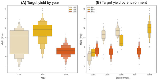 The ground truth yields corresponding to each hybrid are depicted in Figure 5. In our processed dataset, 874 distinct maize hybrids were sown throughout the three years, originating from the combination of 815 unique parental lines (Table 1). The hybrids sown in 2018 showed the greatest average yield (p < 0.05; 11.27 ± 2.04), followed by 2017 (p < 0.05; 9.21 ± 2.70) and 2019 (p < 0.05; 7.17 ± 1.18) (Figure 5A). When separating each yield by the environment, the ‘G2FN’ hybrids sown in 2018 possessed the greatest mean yield (11.86 ± 1.48), with ‘G2LA’ hybrids sown in 2017 possessing the lowest mean yield (5.83 ± 1.13) (Figure 5B). There is a trend for the mean yield to increase in 2017 and 2018, depending on the order of hybrids sown from each environment (p < 0.05; Figure 5B). For example, the mean yields sown in 2017 increased from G2LA, followed by DG2F and G2FE. In contrast, the mean yields sown in 2018 increased from G2LA, followed by G2FE and G2FN. Interestingly, the ‘G2LA’ hybrids showed a statistically significant relationship for yield to increase with year (p < 0.05; Figure 5B).