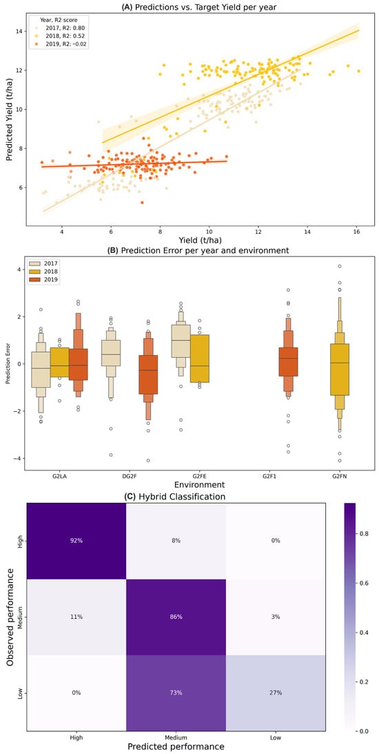 Tab-DNN model holdout results: (A) Comparison between predictions (y-axis) vs. ground truth yields (x-axis) for each sample per year, measured at tonne/ha. (B) Comparison between prediction error (y-axis) vs. environment (x-axis) for each sample per year. Calculated by subtracting the predicted yield from ground truth. (C) Confusion matrix showing the percentage of correctly predicted hybrids that were classified as either high (>10 tonne/ha), medium (6–9.99 tonne/ha), or low (<6 tonne/ha). Ground truth classifications are represented on the y-axis, with predicted performance on the x-axis.