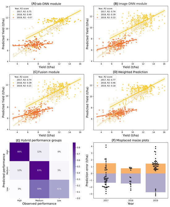 Yield predictions were generated from the multimodal architecture when trained from scratch. Comparison between predictions (y-axis) vs. ground truth yields (x-axis) for each sample by environment and year, measured at tonne/ha using tab-DNN predictions (A), Image-DNN predictions (B), fusion module predictions (C), and weighted predictions (D). (E) Confusion matrix showing the percentage of correctly predicted hybrids that were classified as either high (>10 tonne/ha), medium (6–9.99 tonne/ha), or low (<6 tonne/ha). Ground truth classifications are represented on the y-axis, with predicted performance on the x-axis. (F) Classification error plot showcasing hybrids predicted as medium yield but with a ground truth class of high yield (light purple), and hybrids predicted as medium yield but with a ground truth class of low yield (mustard).