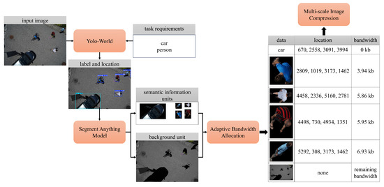 As shown in Figure 2, the task requirements parsed from the task knowledge base are “person” and “car”. We assume that, given the task background, “person” is more important than “car”. Subsequently, Yolo-World obtains the labels and location boxes of task-related targets based on these requirement prompts. SAM completes the semantic segmentation based on the location boxes. Then, an adaptive bandwidth allocation algorithm assigns bandwidth to each unit. In this process, we have segmented the images in the dataset and used the results to form a simple domain knowledge base, which includes “car”. We can find that each unit related to “person” is allocated different bandwidth, while the unit related to “car” is converted to a label. The remaining bandwidth is assigned to the background unit. Finally, the multi-scale image compression algorithm utilizes the allocated bandwidth to compress all the units and subsequently transmits them to the channel, along with the label data and corresponding location data.