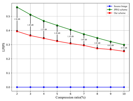 In the experimental process, traffic detection with requirements “person” and “car” is taken as the task. In order to simplify the experimental setup, we set the relevance scores of these two requirements both as , and the hyper-parameter thresholds set to . Based on Equation (6), we calculate the weighted LPIPS of our scheme and JPEG scheme across various compression rates. The experiment results is shown in Figure 6.