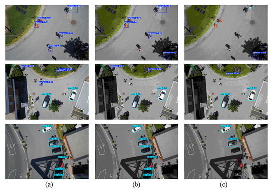 Comparison of target detection rate for images of different schemes: (a) Original image. (b) Rebuilt image of semantic communication. (c) Image compressed by traditional algorithm.