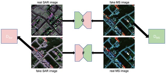 SAR can be used under all-day and all-weather conditions alongside its disadvantages. In some poor atmospheric conditions, only SAR images can be obtained; converting them to MS images can compensate for the shortcomings of MS and SAR images. So recently, some researchers are willing to complete SAR-to-MS image translation (S2MST) in order to avoid their drawbacks [7,8]. S2MST through manual labeling by humans requires substantial manpower and time investment. At the same time, image-to-image translation (I2I) by artificial intelligence [9] is continuously growing with the development of machine learning (ML) and deep learning (DL) [10,11,12,13]. Most of the I2I studies are based on a generative adversarial network (GAN) [14] and its variants [15,16,17]. pix2pix [14] is based on conditional generative adversarial networks [17], which is the first method to achieve widely recognized good results in I2IT. And then a cycle-consistent adversarial network (CycleGAN) [16] was raised for the well-known unsupervised I2IT. Nevertheless, those methods are designed to solve natural images’ translation problems. So presently, the majority of S2OT works are using CycleGAN as their backbone network for image translation [18,19,20].