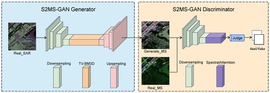 The overview framework of S2MS-GAN. The architecture consists of two primary components: the generator and the discriminator. The generator takes real SAR images as input, applies downsampling followed by noise removal and edge enhancement using a TV-BM3D module, and finally upscales the output to produce the generated MS images. These generated MS images, alongside the real MS images, are fed into the discriminator. In the discriminator, the input undergoes downsampling and spectral attention before passing through the final classification stage to determine authenticity.