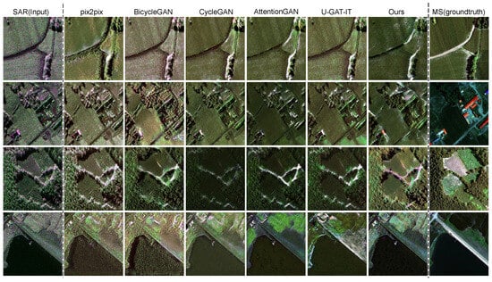 The conclusions drawn from Figure 6 are largely consistent with those from Figure 5. In the first image, CycleGAN exaggerates the green areas and reduces brightness excessively, whereas the other models achieve relatively better translation results. On the right side of the forest clearing, the SAR image contains significant noise, which our model successfully smooths, improving the image’s readability. The second image presents the challenge of translating the road, which proves difficult. Compared with other models, which produce blurry translations in the bottom–right corner, our model closely aligns with the original image and maintains a consistent overall color tone. The third image is particularly notable, as only our model successfully captures the road adjacent to the vegetation. Other models either blur the road or fail to interpret the road information entirely. AttentionGAN, in particular, over-focuses on irrelevant details, generating artifacts in the center of the image. The fourth image vividly illustrates the importance of the denoising module in our model. Other translation models not only fail to remove the noise from the vegetation on the left side of the SAR image but even amplify it. In contrast, our model significantly reduces the noise while preserving the original structure of the vegetation.
