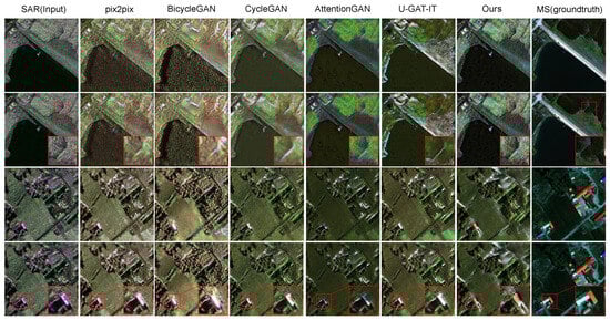 As shown in Figure 7, in the detailed view of the first set, the focus is on the magnified edge of the image. It is clearly obvious that our model effectively captures the forest edge, while other models do not perform well. Although U-GAT-IT also shows the edge, it has missing information on both sides and appears rather blurred. In the second set, the lower left corner where there is a house is magnified. Only our model successfully converts the red house, providing more abundant overall spectral information and generating a much smoother corresponding surface image.