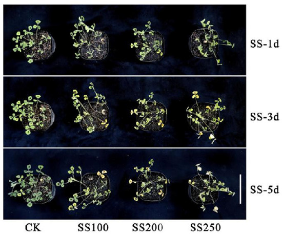 Growth diagram of alfalfa under different treatments. CK is the control group, SS is the salt stress group, SS100 represents the salt concentration of the stress group of 100 mmol/L, SS-1d represents the first day of alfalfa growth diagram.