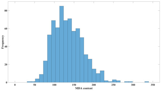 To measure the MDA content in the Medicago truncatula leaves, immediately after acquiring the spectral curves, the leaves were frozen at −2 °C. Subsequently, the MDA content was measured using the kit provided by Suzhou Keming Science and Technology Co., Ltd. (Suzhou, China). Three biological replicates were utilized to minimize experimental errors, and the significance of the difference passed the statistical t test. The sample histogram is shown in Figure 2.