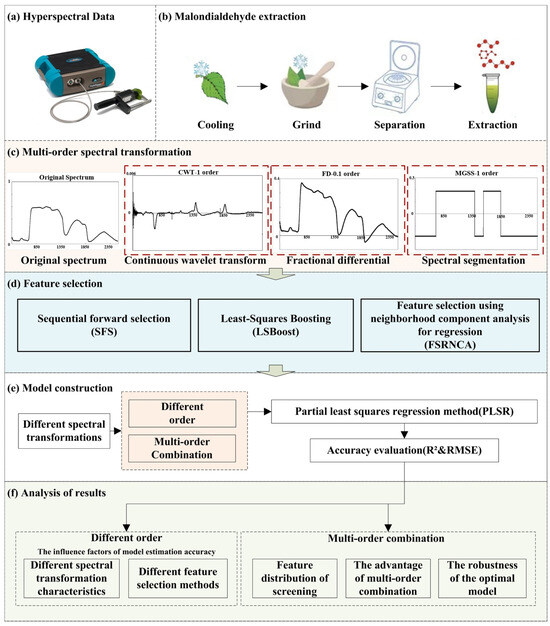A workflow diagram of the experimental design, feature extraction, and modeling. (a) Hyperspectral data; (b) Malondialdehyde extraction; (c) Multi-order spectral transformation; (d) Feature selection; (e) Model construction; (f) Analysis of results.
