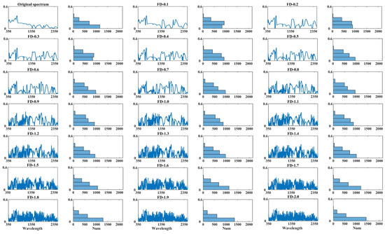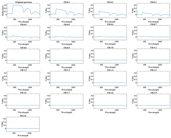 Multi-order FD is an extension of integer-order differential, and it is also one of the most commonly used spectral transformation methods in recent years. It can make up for the data loss problem caused by integer-order differential transformation. The algorithm has been applied to soil chemical element content, water nitrogen concentration, chlorophyll estimation, and other fields to improve the estimation accuracy of the target. In this paper, 20 order results in the range of 0.1–2 were analyzed with 1 as the step size and 0.1 as the arithmetic interval (Figure 6, Formulas (5)–(7)).