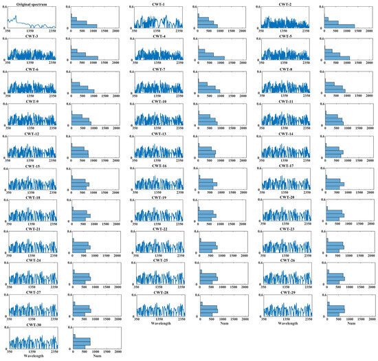 Comparing the correlation coefficients between the original spectrum and the multi-order CWT characteristics and MDA content (Figure 8), we found that the number of bands with correlations of 0.2 or more between the CWT characteristics and MDA content was significantly greater than that of the original spectrum. As the CWT characteristics order increased, the characteristics shifted from being mostly distributed in the 0–0.1 interval to the 0.1–0.4 interval, significantly boosting the number of bands with larger correlation coefficients with MDA content. Combining Figure 5 and Figure 8, it can be found that the waveforms of CWT characteristics of different orders were different, but their correlation distribution was stable after the 15th order.