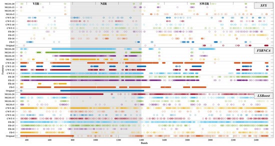 Figure 10 showed the selected features and distribution of the model based on the SFS, LSBoost, and FSRNCA methods for screening the original spectrum and three different orders of transformation features. From Figure 10, it can be seen that the sensitive features of the original spectrum selected based on the SFS method were mainly distributed in the 1900–2500 nm range; the sensitive features of the MGSS features were mainly distributed around 1350 nm and 1850 nm; the low-order FD features were mainly distributed around 450 nm, 1350 nm, 1750 nm, and 2080 nm and the higher-order FD features were mainly distributed in the NIR and SWIR spectrum; and the CWT features increased the sensitivities of the VIR and NIR spectrum to the MDA content, and the selected features were uniformly distributed. The sensitive features of the original spectrum selected based on the FSRNCA method were mainly distributed in the NIR; the sensitive features of the MGSS features were mainly distributed between 600 and 1400 nm; the low-order FD features were mainly distributed in the VIR and the high-order FD features were selected to have more features to yield better estimation results; and the CWT features selected based on the FSRNCA method showed aggregation in a small area range and a large range of uniform distribution.