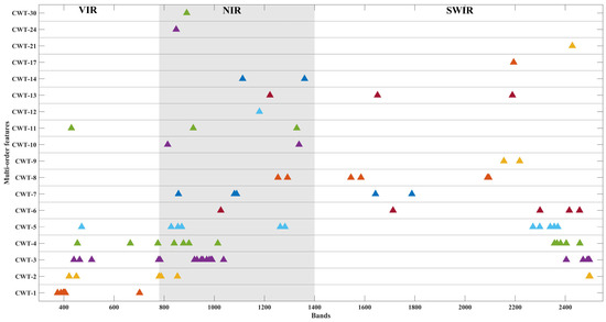 In this paper, we screened the features based on the SFS, LSBoost, and FSRNCA method for three transform features of all order combinations, respectively, and established PLSR models. Among them, the model built based on the SFS method and 1–30 order CWT features had the best results. Figure 11 shows the model entry features screened based on the SFS method for the CWT 1–30 order combination features. They were mainly distributed in the 1st–8th orders and 9th–14th orders. The features selected in the 1st–4th orders were mainly concentrated in the VIR and NIR of 400–1100 nm and the SWIR of 2300–2500 nm. The features selected in the 6th–8th orders were mainly concentrated in the NIR and SWIR of 1000–2200 nm.