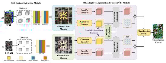 To tackle the aforementioned challenges, we introduce a comprehensive joint classification method for HSI and LiDAR data, termed Adaptive Feature Alignment Network with a Global–Local Mamba. It contains two branches: an HSI branch and a LiDAR feature processing branch. Specifically, we propose an SSE feature extraction module to process HSI and LiDAR data separately to mine more spectral–spatial and elevation features. It can fully extract adaptive feature information while considering data discretization. In addition, to capture semantic information at multiple scales, we also propose Global–Local Mamba modules for the two types of data sources to achieve dynamic awareness of spectral–space–elevation information. Finally, to eliminate the inherent distinction between the expressions of the two types of data in the upper and lower branches, we design an SSE Adaptive Alignment and Fusion (F) module that alleviates the feature differences and spatial mismatches between the data sources by learning the discriminative features of the both types of data to adapt to the calibration differences.