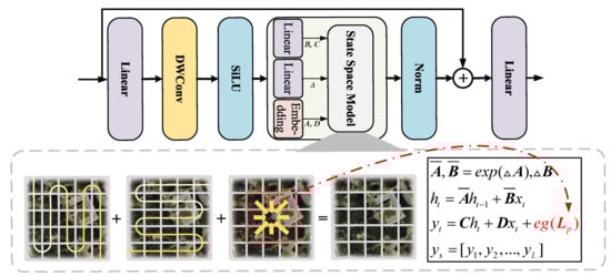 Illustration of Global–Local Mamba Encoder. DWConv denotes Depth-Wise Convolution and SiLU denotes the Sigmoid Linear Unit function. Also, is the state matrix, is the input matrix, is the output matrix, and is the feed-through matrix. We introduce a selective state-space model with the premise of allowing the spatial features of localized objects to be enhanced by adjusting parameters according to the inputs. This enhances selective information processing across sequences.