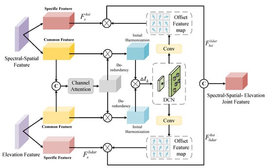 To learn the spatial shift between modalities from the guided subspace as a strong prior for subsequent alignment and fusion, we use deformable convolutions to achieve implicit offset compensation. Taking into account the varying contributions of each spectral and sub-band region to classification, we first introduce a modulation scalar learned from , which dynamically aggregates information from the surrounding area of the corresponding position p. As depicted in Figure 3, given the center-sampled value in the modality-specific feature or and the modulation scalar , the corresponding value in the aligned feature can be derived as follows: