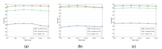 Parameter Setting Adjustment: (1) Patch Size: For joint HSI and LiDAR data classification methods, choosing an appropriate patch size means that the model can consider more neighborhood pixels with limited computational cost, which may better capture the spatial distribution, band changes, and elevation information characteristics of ground objects. In the dataset presented above, we fixed all parameter settings except patch size. In addition, in order to select the appropriate patch size, we evaluated the accuracy effect of the patch sizes in the set {7, 9, 11, 13, 15, 17} in sequence. As shown in Figure 7, an excessively large patch size will cause the method, especially the scalar fusion module, to have more complex inputs, resulting in a reduced network fitting effect and thus reduced accuracy. A patch size that is too small will result in insufficient data context information, thereby affecting global information retention and resulting in insufficient accuracy. It can be seen from this experiment that a patch size of 11 is the most appropriate.