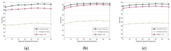 Effect of reducing spectral dimensionality on the OA, AA, and Kappa coefficient. (a) MUUFL Gulfport. (b) Trento. (c) Augsburg. It can be seen that our method shows different sensitivities to reductions on different datasets, thus better tuning the hyperparameters of the model to the optimum.
