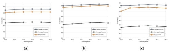 Effect of learning rate on the OA, AA, and Kappa coefficient. (a) MUUFL Gulfport. (b) Trento. (c) Augsburg. It can be seen that our method shows different sensitivities to the learning rate on different datasets, thus better tuning the hyperparameters of the model to the optimum.