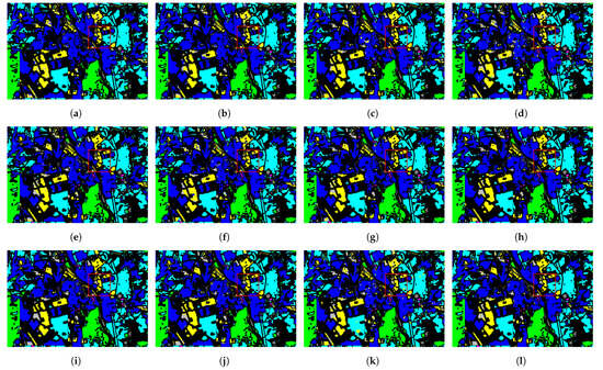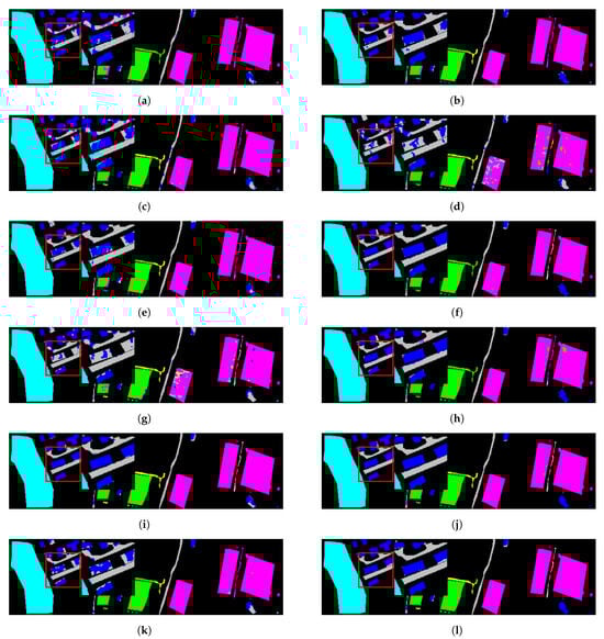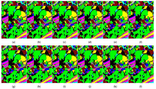 Maps depicting the classification of MUUFL Gulfport using various methods. (a) RF. (b) SVM. (c) 2D-CNN. (d) HybridSN. (e) GAHT. (f) MiM. (g) CoupledCNN. (h) CALC. (i) HCTnet. (j) M2FNet. (k) HLMamba. (l) AFA–Mamba.