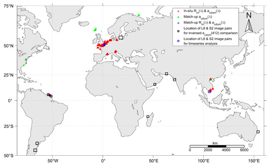 Global distribution of the in situ (red triangles) and match-up dataset for acdom (λ) (green triangles) and for both Rrs (λ) and acdom (λ) (blue triangles) data points. The squares represent the locations of Landsat-8 and Sentinel-2 near-simultaneous nadir-captured image pairs used for the calibration of acdom (412) product (black squares) and the time series analysis (blue squares).