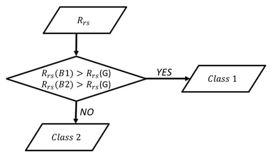 Jiang et al. (2021) [54] proposed a water classification scheme that compares the Rrs (λ) values at 490, 560, 620, and 754 nm to identify four water types based on the level of turbidity. We follow a similar approach using the Rrs (λ) values at the first three bands of OLI and MSI. Unlike Jiang et al. (2021) [54], we only define two water classes based on the acdom (412) value, where Class 1 waters are characterized by low values (hereafter referred to as DSM-1), and Class 2 waters (hereafter referred to as DSM-2) by medium-to-high acdom (412) values. While Jiang et al. (2021) used a purely synthetic dataset to formulate their classification, the present one is based on DSM including both synthetic and in situ data. Based on different tests, a simple condition using the Blue 1 (B1), Blue 2 (B2), and Green (G) bands (centering at 443, 490, and 560 nm, respectively) of both MSI and OLI was formulated. A flow chart of our water classification process is presented in Figure 3, while Figure 4 shows the distribution of acdom (412) for DSM, DSM-1, and DSM-2. A pixel is considered Class 1 if both the reflectance values at B1 and B2 are higher than the reflectance value at the G band, otherwise, it belongs to Class 2. The median values of the two water classes, 0.0275 m−1 for Class 1 and 0.34 m−1 for Class 2, confirm that the condition successfully separates two ranges of acdom (412) values. It is also noted that the distribution of the two water classes overlaps in the log10 (acdom (412)) range between −1 and −0.5, indicating that the algorithms for each class can reasonably estimate each other over this common range. This creates a soft boundary between the water classes on the acdom (412) map, of which an example is shown in Figure A3 using a sample OLI image.