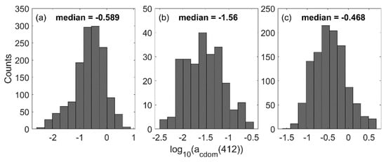 Histograms of the acdom (412) values for (a) DSM, (b) DSM-1 (i.e., Class 1), and (c) DSM-2 (i.e., Class 2).