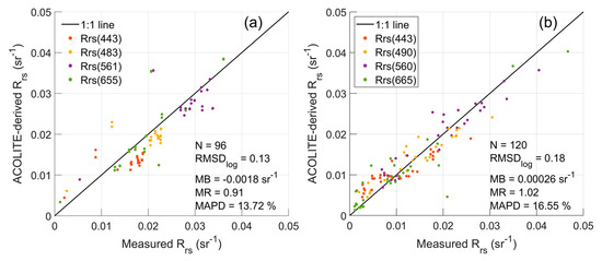 Comparison of ACOLITE-derived and measured values of Rrs (λ) from the (a) OLI and (b) MSI 10 m spatial resolution (right) match-up dataset. The different statistical indicators calculated for the data of ACOLITE-derived versus measured Rrs (λ) are provided (see text for details). The solid line is the 1:1 line. The different colors stand for a given wavelength.