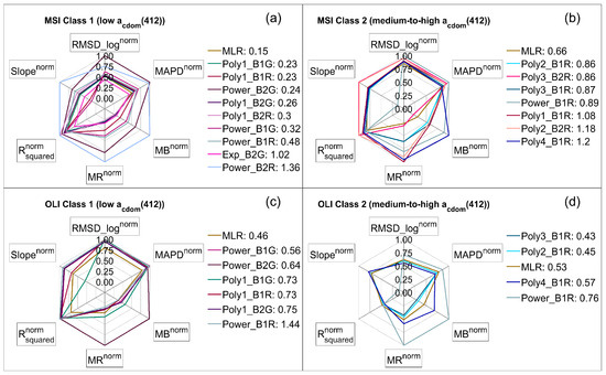 Radar plots summarizing the performances of the different acdom (412) algorithms as indicated for (a) MSI and Class 1 water, (b) MSI and Class 2 water, (c) OLI and Class 1 waters, and (d) OLI and Class 2 waters. The number following the algorithm name represents the value of the surface of the polygon (the smaller the value the better the algorithm performs).