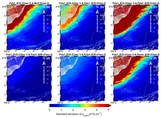 The MSI maps of the standard deviation of modeled acdom (412) at a 60 m spatial resolution for the algorithm combinations listed in Table 3. The name of the algorithm for each water class in each combination is displayed at the top of each individual map from (a–f).