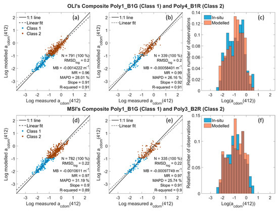 The many different combinations of algorithms for Class 1 and 2 selected in Section 3.2 were tested on the OLI’s Mu-CDOM match-up dataset. While combinations with an R2 less than 0.65 were discarded, the remaining combinations were ranked based on the area indicator, and the best combinations are shown in Table 2. Based on this exercise, it appears that Poly1_B1G for Class 1 in combination with any of the five Class 2 algorithms presents the best match-up performances, i.e., having the lowest polygon area. In contrast, although MLR for Class 1 shows the best performance on DSM-V, it presents the lowest retrieval accuracy of acdom (412) over Mu-CDOM compared to the other empirical formulations. This could be explained by atmospheric correction errors which impact the different absolute values of Rrs (λ) used in MLR, especially in relatively clear waters (i.e., low signal-to-noise ratio (SNR)). In contrast, the use of Rrs (λ) band ratios by the other formulations may help to mitigate the atmospheric correction errors.