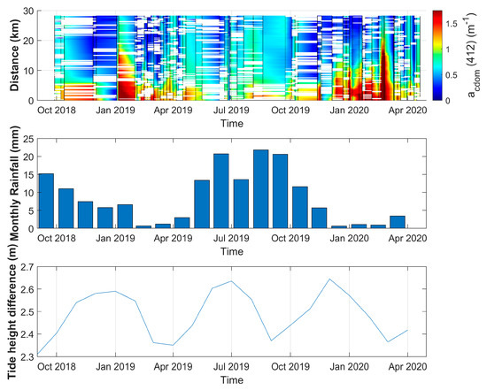 We applied AquaCDOM to analyze the temporal variability of acdom (412) along a transect in the Mekong Delta, Vietnam, which spans from the outlet of the Ganh Hao River to offshore waters. The variability was analyzed in comparison with the monthly accumulated rainfall and the monthly mean intraday high and low tide height difference; all of which are shown in Figure 15. The rainfall data were taken from the remote sensing-derived NASA’s Global Precipitation Measurements (GPMs) (https://gpm.nasa.gov/ (accessed on 23 August 2022)), while the tide data come from the modeled tidal calendars of Vietnam (published yearly by the Vietnam Administration of Seas and Islands). The acdom (412) values peak during the first few months of each year and spread up to about 20 km offshore. Relatively low acdom (412) values were observed for the rest of the year, especially from April 2019 to December 2019. A second maximum, of much lower intensity, was also observed in October when the Mekong River outflow was at its maximum [68]. Interestingly, these extrema of acdom (412) are not in phase with the monthly rainfall stressing that the acdom (412) variability at the outlet during this time period is not driven by meteorological factors, specifically from land washing by rainfall. However, the CDOM content during this period may also be due to dilution processes during the rainy season. Besides this general seasonal pattern, other environmental forcings also act on the regional CDOM dynamics. Tidal forcing explains the export of CDOM offshore in January 2019 when the rainfall was low. Specifically, the higher gap observed between high and low tides during this period results in a stronger tidal export. Other exceptional events can also be identified, emphasizing the impact of human pressure on CDOM distribution. The CDOM temporal pattern, in this area characterized by large aquaculture activities [69], matches the stocking period of shrimp ponds, which are located along the Ganh Hao River near the coast. During the stocking time (typically from February to May), the pond water is generally replaced before the installation of new shrimp batches, and the treated wastewater, which contains high organic matter loading, is discarded into the river. In 2020, COVID-19 disrupted the global distribution of aquaculture goods forcing global farmers to keep their harvest or sell at a low price [70]. In addition to being affected by COVID-19, the Mekong River Delta in Vietnam suffered a drought at the beginning of 2020, which is visible in the precipitation plot. This forced the farmers to only partially stock their ponds waiting for better weather conditions and market stability [71]. This could explain the second peak of acdom (412) in March 2020 despite low rainfall and weak tidal forcing, while only one was visible in 2019.