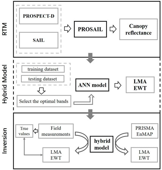 Workflow diagram of the hybrid model combining the radiative transfer model (PROSAIL) and artificial neural network (ANN) for retrieving LMA and EWT.