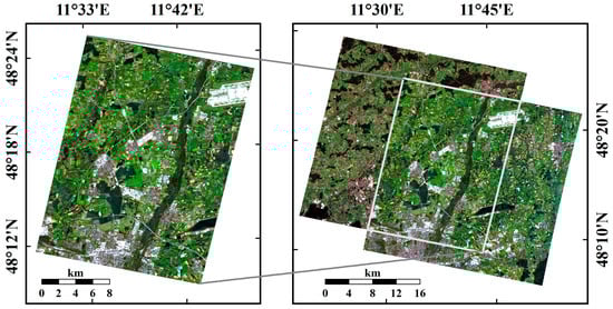 Two remote sensing images from the northern part of Munich, southern Germany, were selected for this study. The PRISMA image data were collected on 27 October 2022, and the EnMAP image data were acquired on 25 October 2022 (with minor cloud cover). The downloaded images were projected and georeferenced using ArcMAP 10.8 software before being used. The study area (Figure 2) lies in the northern part of Munich, southern Germany (48°16′N, 11°40′E), characterized by a temperate marine west coast climate. The terrain is relatively flat, dominated by hills and plains, with some small lakes and rivers nearby providing water sources for the region, contributing to agricultural and urban development. The Munich-North-Isar (MNI) observatory station is located here, which is an agricultural comprehensive long-term experimental field preparing for the EnMAP mission.