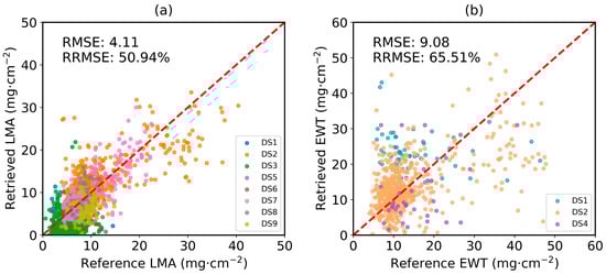 Cross-validation results of (a) LMA and (b) EWT inversion using PRISMA and EnMAP images. The red dashed line represents the 1:1 relationship.