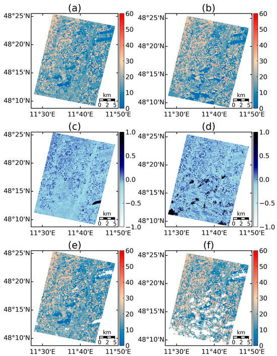 The retrieved LMA values for PRISMA and EnMAP are shown in Figure 5a and Figure 5b, respectively. It is seen that the retrieved LMA has similar spatial distributions for PRISAM and EnMAP, except in the lower right region, where the EnMAP image is contaminated by clouds. The corresponding ARDSI2200,1640,2240,1720 images for PRISMA and EnMAP are plotted in Figure 5c and Figure 5d, respectively. The figures show that the retrieved LMA has a similar pattern to this index that is associated with LMA. However, it is noticed that both the retrieved LMA and the ARDSI2200,1640,2240,1720 exhibit some anomalous high values over the non-vegetated areas, such as the Munich International Airport (upper right of the image). The mapped LMA images were further processed, and the values where the corresponding Normalized Difference Vegetation Index (NDVI) was lower than 0.1 were masked. The results with the non-vegetated areas masked are illustrated in Figure 5e and Figure 5f for PRISMA and EnMAP, respectively, and they show that most of the abnormal values were from the non-vegetated areas.