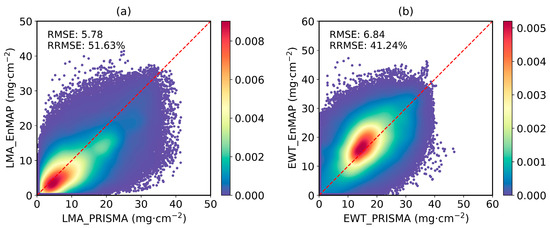 The cross-validation of remote sensing products is an indirect validation method that harmonizes different products with similar temporal characteristics into a consistent projection coordinate system and spatial resolution, assessing the effectiveness of products through intercomparisons [62]. The PRISMA and EnMAP images underwent georeferencing, followed by cloud removal and the identification of vegetation-covered areas (NDVI ≥ 0.1). Then, the LMA and EWT values were extracted for each overlapping pixel from the processed images, and a comparative analysis was conducted to further support the validation process. The comparisons of the LMA and EWT are shown in Figure 7a and Figure 7b, respectively. The results present an RMSE of 5.78 mg·cm⁻² and an RRMSE of 51.63% between the LMA values obtained from the two images. For the EWT, the RMSE was 6.84 mg·cm⁻², with an RRMSE of 41.24%. In the low-value region, the LMA is characterized by dense clustering and exhibits a certain degree of correlation, with minimal variability. In contrast, the distribution in the high-value region is more dispersed, although it generally aligns with the 1:1 fitted line. The EWT values between the two images are comparable, with the overall distribution concentrated near the 1:1 line. The large volume of data results in numerous discrete points in the scatter plots. Overall, the cross-validation results underscore the robustness and consistency of the model across different remote sensing datasets.