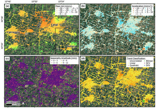 The trend classification map shows a general linear (~59%) and quadratic (~40%) time series behavior, with a cluster of quadratic points coinciding with the area of Carpi where the highest subsidence velocities and decelerating values were observed (Figure 4d). Only less than 1% of the time series exhibits different behavior. Among them, a cluster of bilinear points (0.14%) was identified over Soliera, aligning spatially with the highest accelerating area identified in Figure 4b. For these points, PS-Time software v.1.1 (64-bit) identified breakpoints in the time series between May 2021 and December 2021 (see Figure A1 in Appendix A).