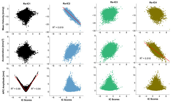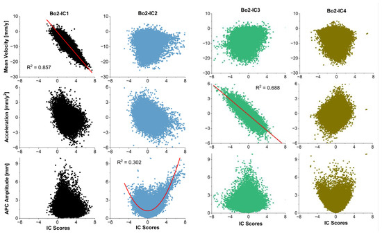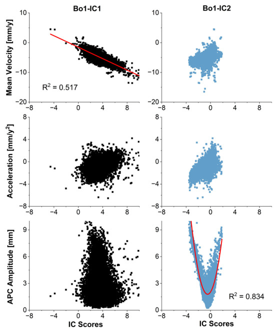 To confirm the relationship between the different components retained for each area and the mean deformation velocity, acceleration, and seasonality parameters previously analyzed, a regression analysis was pursued and R2 values were calculated (Figure 8, Figure 9, Figure 10 and Figure 11). Linear fittings were performed for mean deformation velocity and acceleration correlations, while a quadratic fitting was applied for the amplitude of the annual periodicity component (APC) parameter. In all cases, the components that displayed linear trends (Ra-IC2, Bo1-IC1, Bo2-IC1, and So-IC3) are accurately correlated with the mean deformation velocity measured in each area, showing a negative linear correlation, with R2 values ranging between 0.517 and 0.857. Similarly, quadratic ICs (Ra-IC4, Bo2-IC3, and So-IC1), which spatially seemed to correlate with the accelerating and decelerating trends observed on the maps, show a clear negative linear correlation with the accelerating values calculated from EGMS products, with slightly lower R2 values, ranging between 0.518 and 0.709.