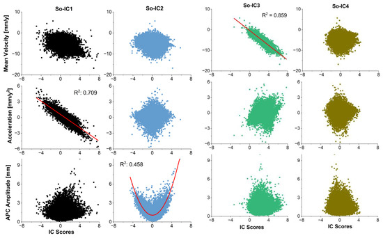Correlation between mean deformation velocity, acceleration, and amplitude of the APC, from EGMS products and PS-Time analysis, and the ICs retained for the area of Soliera. Linear or quadratic fitting (red lines) and R2 values are shown in the graphs that show the best correlation.