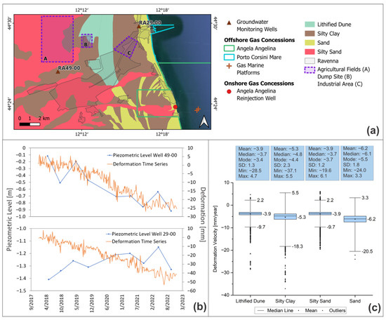 (a) Geological map with the location of the principal gas fields operating near the coast of Ravenna and two ARPAE groundwater monitoring wells, overlapped onto Google satellite imagery; (b) Comparison between piezometric level variations in ARPAE’s monitoring wells RA49-00 and RA29-00 and the deformation time series of contiguous points; (c) Deformation velocities observed within each lithological unit, expressed in [mm/year]. Gas exploitation data in (a) is made available by the Italian Ministry of Environment and Energy Security [58], while the location of the monitoring wells and the geological layers were downloaded from the MinERva Portal, managed by the Emilia-Romagna Region service [46].