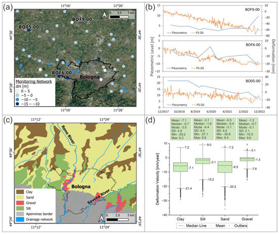 Recognized as one of the most important subsidence hotspots over the Emilia-Romagna region, the city of Bologna experienced peak subsiding velocities of up to −100/−110 mm/year in 1970−1982, and a lessening in ground deformation rates has been observed during the last 30 years, mainly due to an increase in regional groundwater pumping regulations and subsidence monitoring activities [59]. Although a significant recovery of deformation rates was observed in 2011−2016, with areas that even showed uplifting behaviors [63], a decrease of up to −20 mm/year in subsidence velocities has been observed in 2016−2021, according to the most recent ground velocity change map published by ARPAE [33]. Subsidence of up to −27.7 mm/year was recognized in the area north of Bologna for the 2016−2021 period [33], aligning with the subsiding values depicted in Figure 3a, that range between −20 and −30 mm/year for the same place, with peak velocities of −35.8 mm/year. The correlation between the subsidence phenomena and groundwater withdrawal activities in Bologna has been observed by different authors in the literature [38,59,60], even focusing on the same study period [64]. The comparison between the change in piezometric levels and the equivalent subsidence velocity implemented in this study showed a good correlation in the majority of cases (except for well BOF9-00, Figure 13b), suggesting that pumping activities continue to be one of the main drivers for the subsidence phenomena affecting the broad area. However, the geological setting also conditions the occurrence of ground deformation, as historically the highest deformation velocities in the area occur mainly associated with the Reno river alluvial fan [38,59,60,62], which is also the place where most of the pumping activities of the area are concentrated. The results of the correlation between the recorded subsidence velocities and the different lithological classes (Figure 13d) suggest that sediment compaction is more predominant in clayey materials, an observation that coincides with what was observed by other authors [59]. Nevertheless, this observation is based on the sole analysis of statistics across the geological layers, with no account for the spatially variable thickness of geological deposits or their geotechnical properties; therefore, more investigation should be done on the detailed correlation with these data to improve this initial assessment. Moreover, a detailed contextualization of the results with respect to the hydrogeology of the area would also be beneficial to complement the investigation.