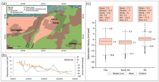 (a) Geological map of Carpi–Correggio–Soliera subsidence hotspot, overlapped onto Google satellite imagery; (b) Comparison between piezometric level variations in MO10-01 ARPAE’s monitoring well and a deformation time series of a contiguous PS–DS point; (c) Deformation velocities observed within each lithology, expressed in [mm/year]. Geological layers used were downloaded from the MinERva Portal, managed by the Emilia-Romagna Region service [46].