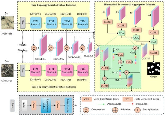This article proposes a CD method based on Mamba architecture, composed of a Tree Topology Mamba Feature Extractor (TTMFE) and Hierarchical Incremental Aggregation Module (HIAM). In contrast to the existing Mamba method, TTMFE replaces the original SSM module with Tree Topology SSM (TTSSM), breaking the limitation of traditional Mamba that can only rely on fixed sequences for information transmission, which enhances the model’s ability to capture the long-range dependency relationships, while maintaining the advantages of global context information extraction ability of the Mamba structure, further enhancing the capability to extract local spatial and structural features. In addition, to better adapt to CD tasks, the HIAM is employed to align and fuse the multi-scale features extracted by TTM. The HIAM has effective interaction with information at different scales, ensuring that important scale features are fully utilized. The main contributions of this study are listed as follows: