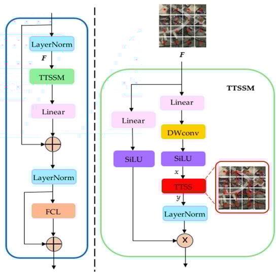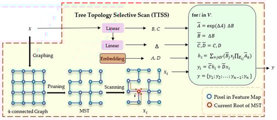 Tree Topology Selective Scan is the core component of the TTSSM. The workflow of TTSS is shown in Figure 3. In TTSS, each pixel of the input feature map is treated as a vertex, and a 4-connected graph is constructed by connecting each vertex to its four directly adjacent vertices. The edge weights in the graph are computed based on the feature similarity between the two connected vertices, where the similarity is measured using cosine similarity. Subsequently, pruning is applied to remove edges with larger weights until a minimum spanning tree (MST) is formed, which is the MST in Figure 3. Then, we apply the BFS algorithm on the MST to generate a sequence and sequentially set each node as the root node of the tree according to this order. Through the MST, the state transition function [44] is used to propagate and aggregate information between all nodes, eventually updating the feature values of each vertex. This approach maximizes the capture of global contextual information, while the tree structure, by establishing connections between pixels with high similarity, effectively preserves local detailed features. This is an advantage that traditional fixed scanning methods in SSM do not possess. For the state transition function, A is the state transition parameter, B is the input mapping parameter, C is the output mapping parameter, and D is the direct input–output mapping parameter. is used to transform the continuous parameters into discrete equivalents, enabling the discretization of continuous State Space Models to handle the discrete input data typically found in tasks such as visual processing.