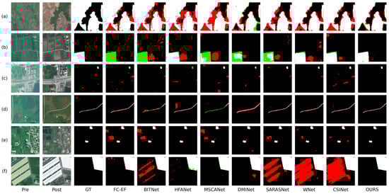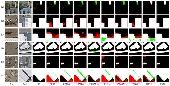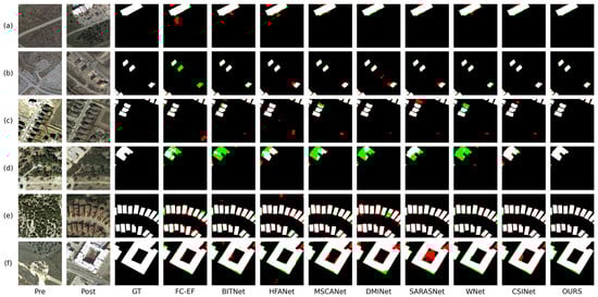 Visual comparison results on the WHU-CD dataset. The red indicates false positives; the green indicates false negatives. (a–f) are six representative scenarios in WHU-CD.