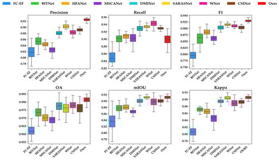 Box plots of the six metrics on LEVIR-CD for the proposed method and comparison methods.