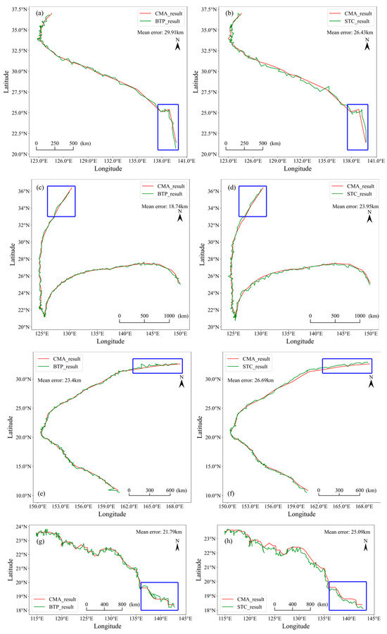 The comparison of the optimal paths of SD, HMN, HL, and HK determined using two typhoon localization methods, with the best path provided by CMA. The left column shows results from the BTP typhoon localization method and the right column shows results from the STC SIFT feature typhoon localization method for typhoons SD (a,b), HNM (c,d), HL (e,f), and HK (g,h). The average accuracy, from comparison with the CMA path, is indicated in each figure. The region outlined by blue lines delineates the portion of the typhoon characterized by lower intensity (before developing into typhoon intensity, TY). Table 4 presents the typhoon localization accuracy for the blue-outlined area.